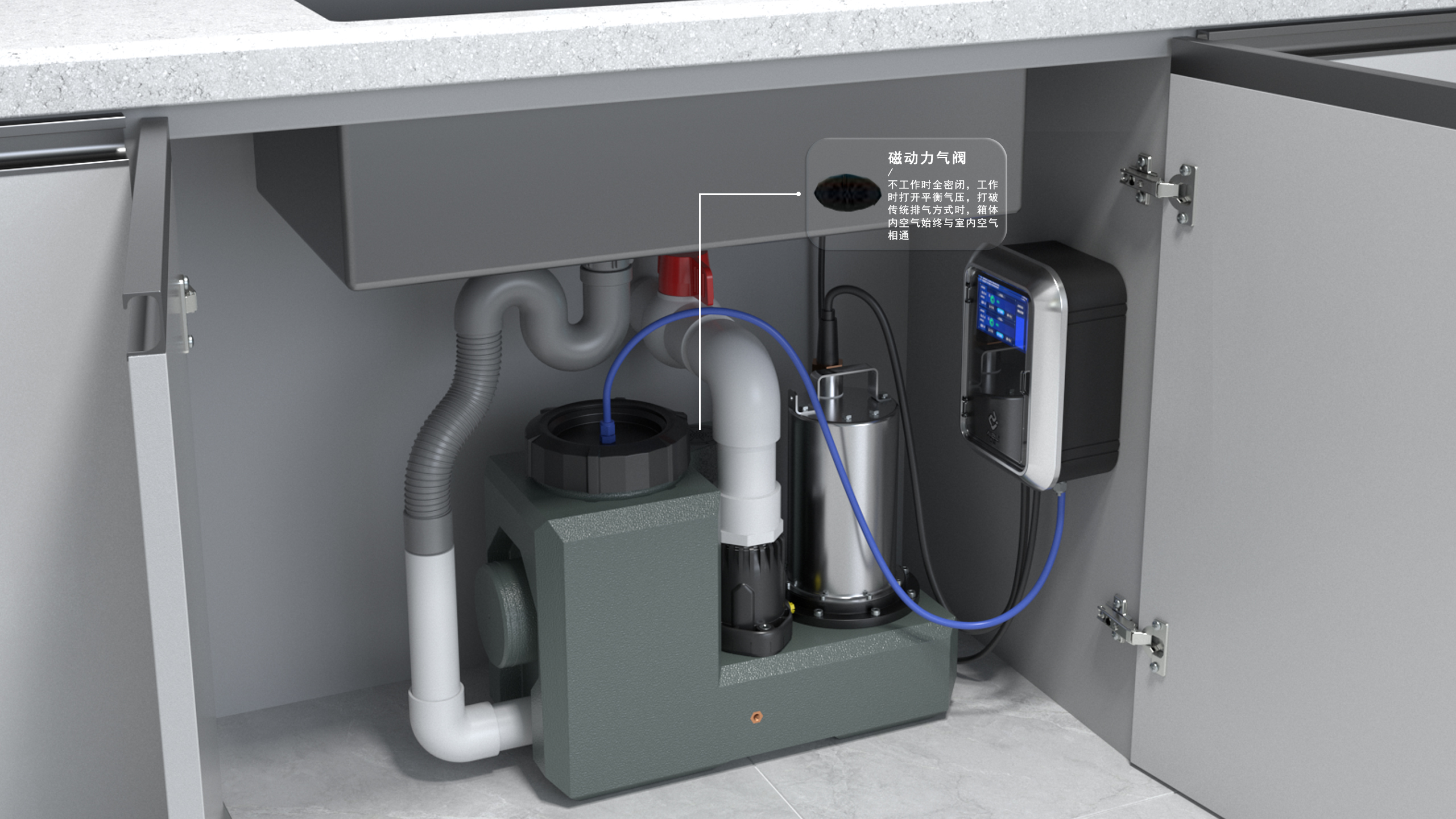 關(guān)于智能污水提升器的安裝位置,一般就放在櫥柜里。箱體小巧簡(jiǎn)單,放在櫥柜也占不了多少地方。管道會(huì)在裝修時(shí)就進(jìn)行鋪設(shè),所以這一套安裝下來,并不會(huì)影響廚房的布局。雖然安裝在了不起眼的地方,也不用擔(dān)心滲水的問題,機(jī)器會(huì)自動(dòng)報(bào)警,將信息發(fā)到互聯(lián)的手機(jī)。能掌控機(jī)器,才是排水的安全感。